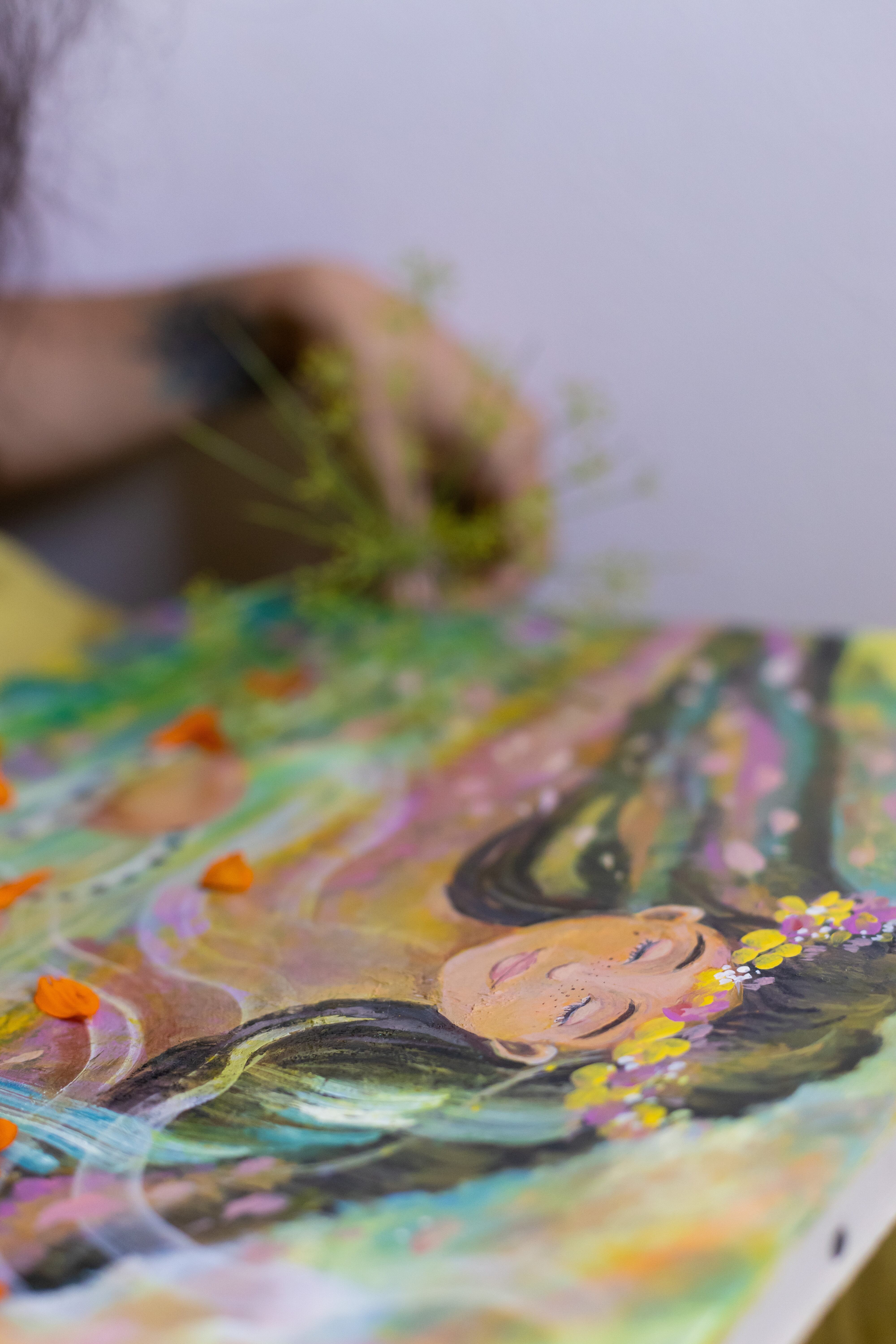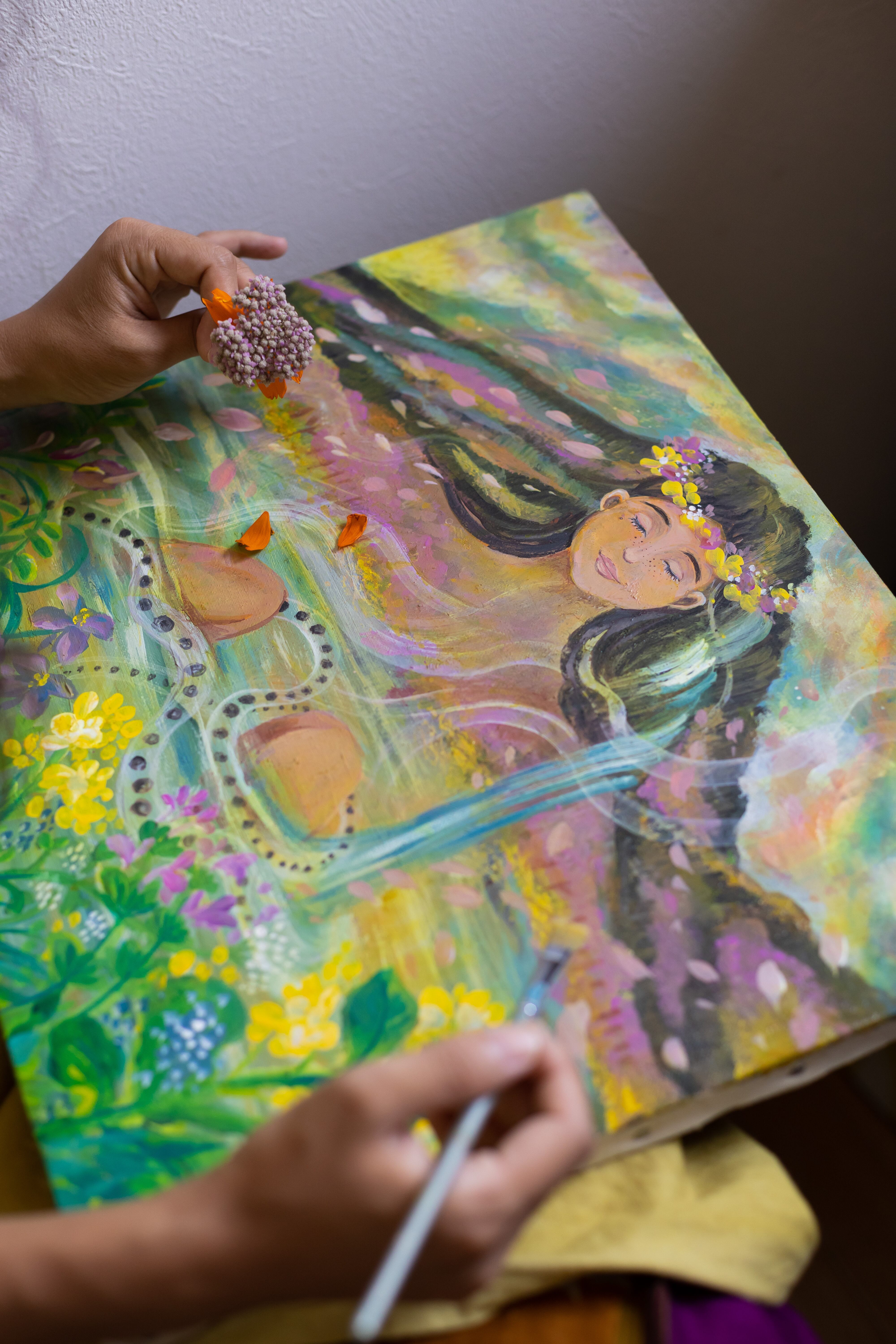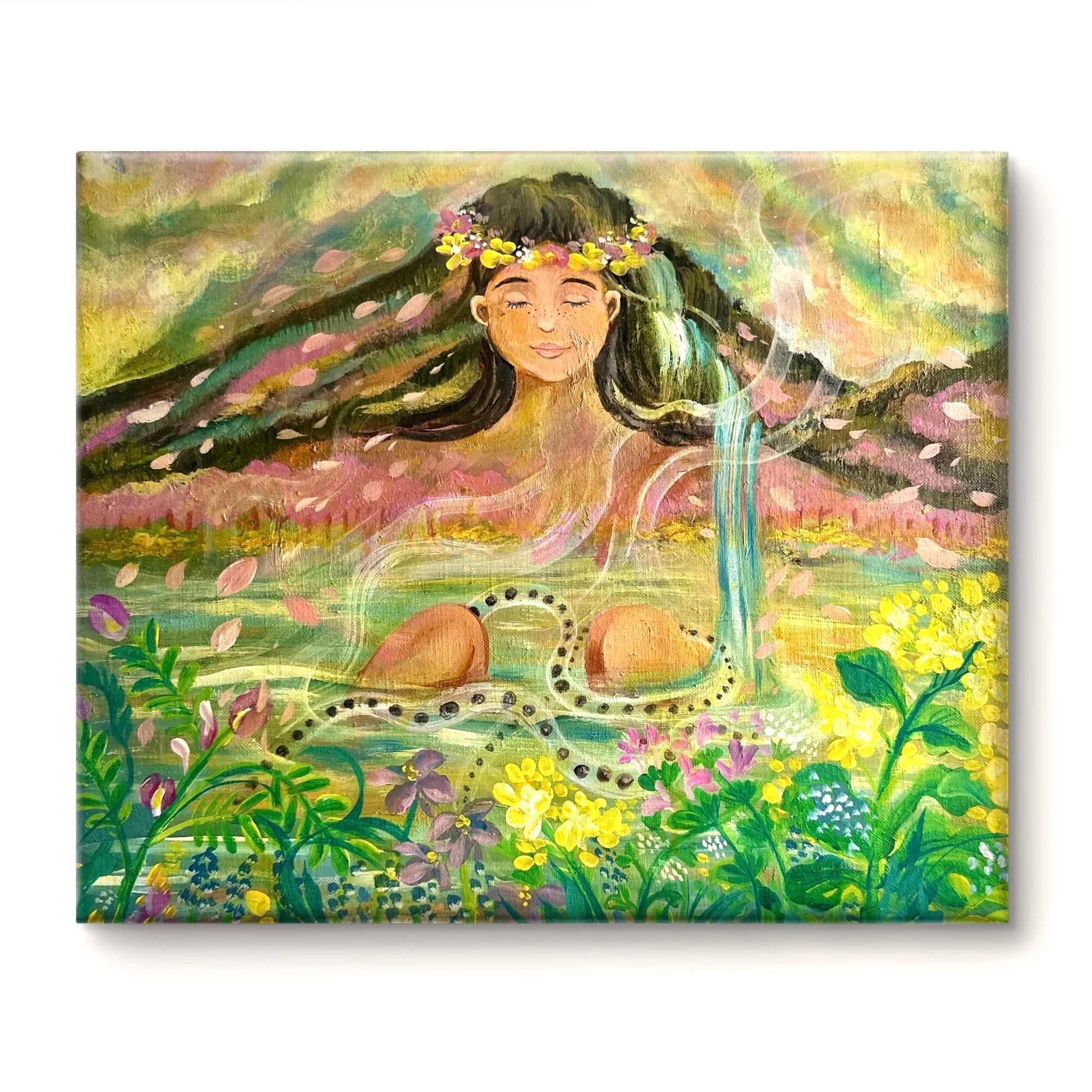 生きとし生けるものたちの調和 自然界の厳しさと美しさ。巡りゆく季節の色とりどりの花々や生き物たちが生まれ死に土に還る この循環が世界を形成し、それぞれの存在がもたらす調和を描きました。私達が幼い時から見ている季節のこの光景や生態系がいつまでまでもあり続けますように。次の世代や子供達にも沢山のお花や虫や魚達、生き物達に