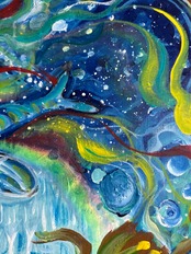 この絵は自身が体験した無農薬の田んぼの田植えとそこに生きている生き物 (左)カブトエビと(右)タガメを描いています。最近はカブトエビは雑草除去に貢献する「田の草取り虫」とも呼ばれ、有機農法などでは意図的に放流されていますがタガメはほとんど見えなくなってしまいました。いつかタガメに会いたいと願っています。